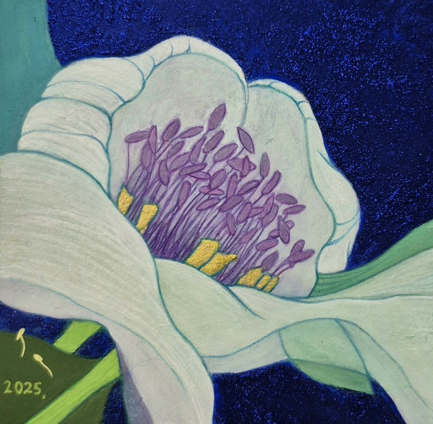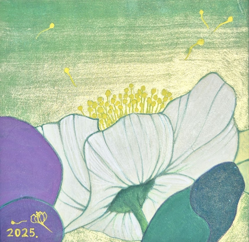 8"x8" oriental powder on jang-ji.2025 Set against a blazing crimson sky, two delicate white flowers sway as if dancing in the wind. Beneath...