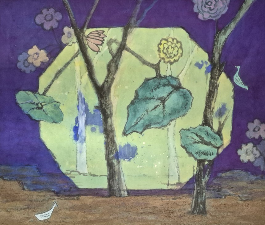 12"x12" oriental powder pigment on jang ji. Set against a deep violet night, vibrant sunflowers bloom with unwavering strength, as if...
